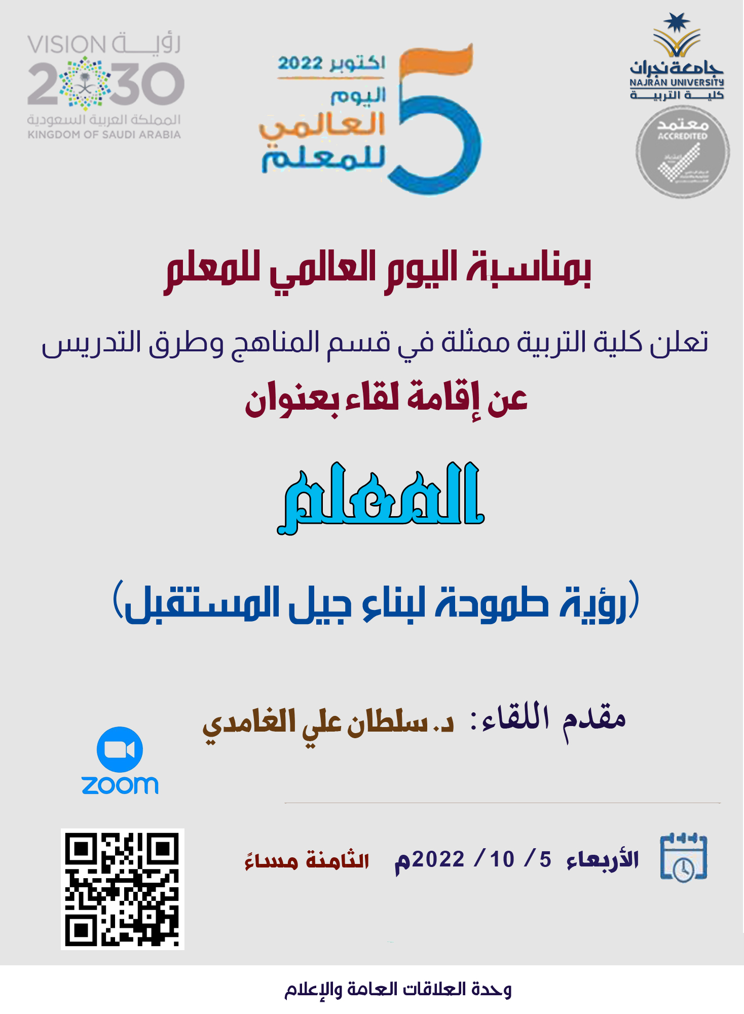 null بمناسبة اليوم العالمي للمعلم تعلن كلية التربية ممثلة في قسم المناهج وطرق التدريس عن إقامة لقاء