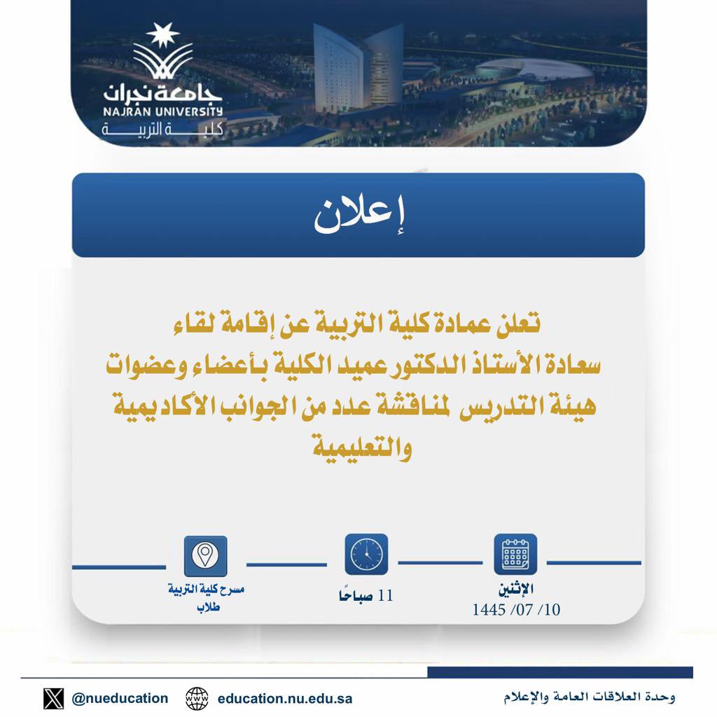 تعلن كلية التربية عن إقامة لقاء سعادة عميد الكلية أ.د محمد بن عبد الله آل مرعي بأعضاء وعضوات هيئة التدريس لمناقشة عدد من الجوانب الأكاديمية والتعليمية.