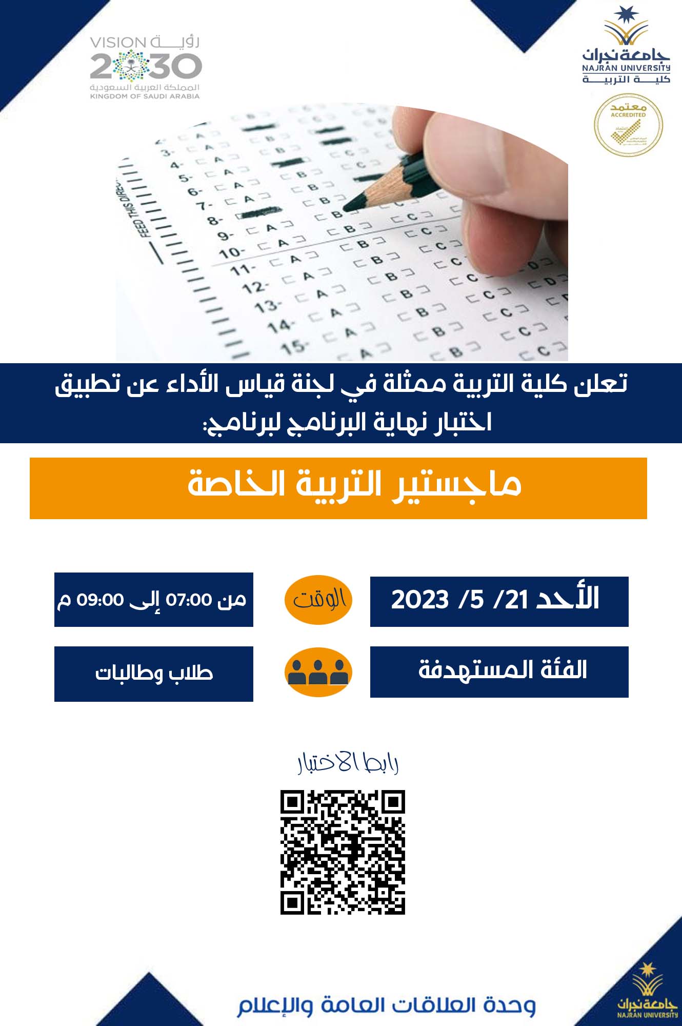 null تعلن كلية التربية ممثلة في لجنة قياس الأداء عن تطبيق اختبار نهاية البرنامج لبرنامج ماجستير التربية الخاصة