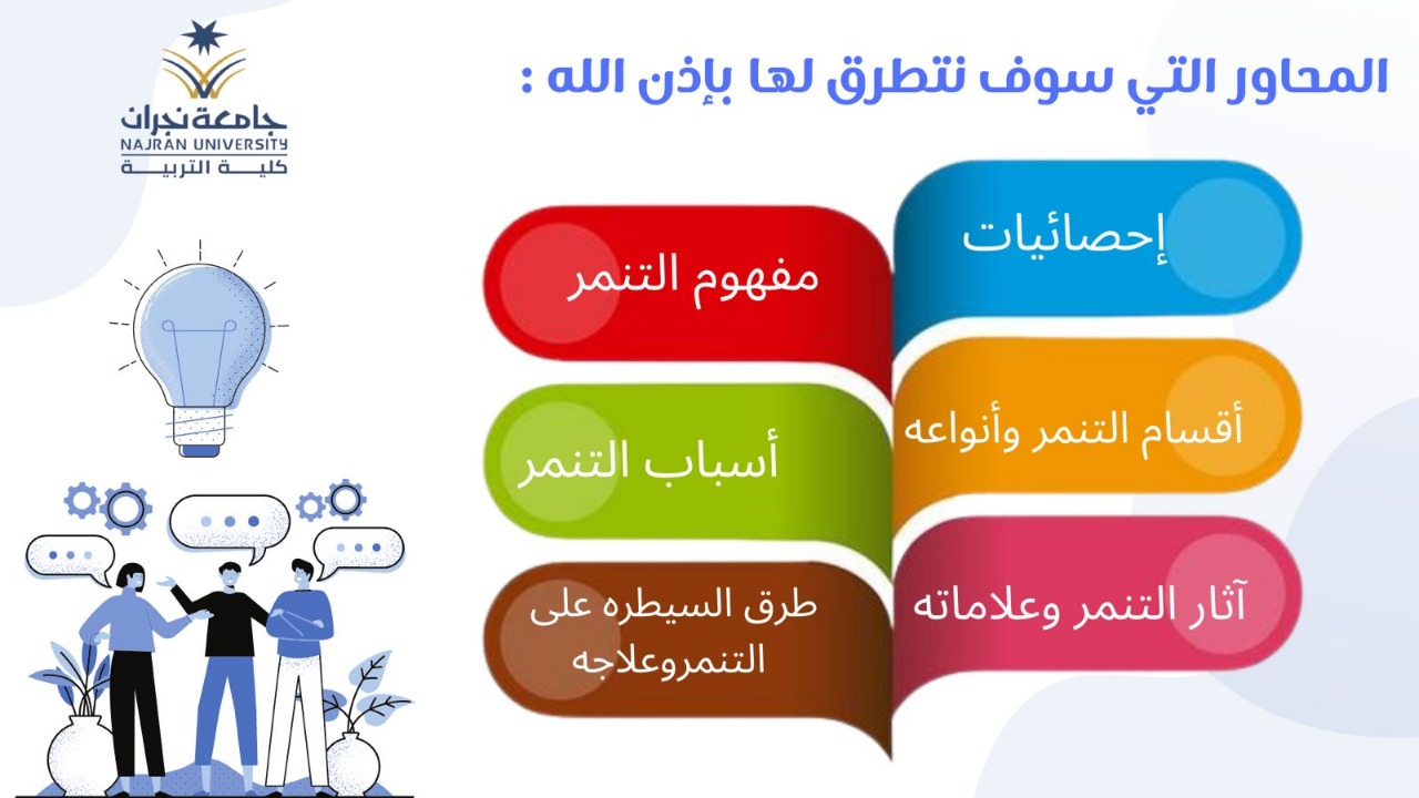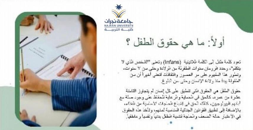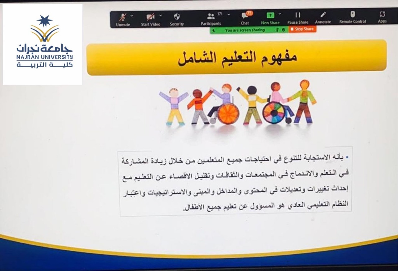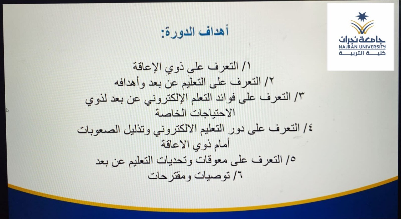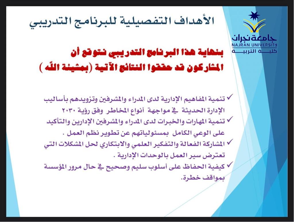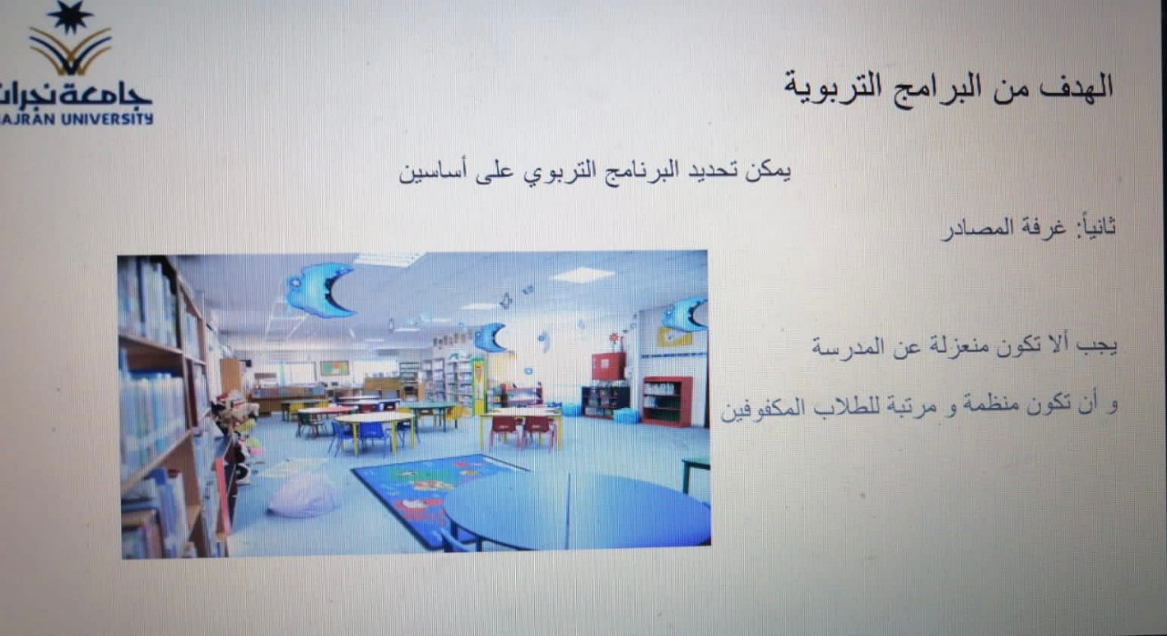 وعلى الجانب الأخر قدمت كلية التربية شطر الطالبات أربعة برامج تدريبية لشاغلات الوظائف التعليمية بإدارة تعليم نجران حيث تناول البرنامج الأول " المهارات الحديثة في إدارة الأزمات والمخاطر وفق رؤية ????) من تقديم الدكتورة : كوثر خلف والذي تناولت فيه : تعريف وأهداف وخطوات إدارة المخاطر، أنواع المخاطر في المؤسسات التربوية ، تقييم ومعالجة المخاطر وفقا لمصفوفة المخاطر ، محددات إدارة المخاطر، بينما تناول البرنامج الثاني " ذوي الإعاقة نحو عالم شامل ومستدام" والذي تناول أربعة محاور رئيسة تمثلت في حقوق ذوي الإعاقة ، التعليم الشامل لذوي الإعاقة ، استراتيجيات التدريس عن بعد لذوي الإعاقة، الضغوط النفسية والاجتماعية لأسر ذوي الإعاقة : وقدمتهن كل من : د. حميلة مجرشي ، د.نوف العتيبي ، أ.رويدا آل سليمان ، وأ.صغيرة آل مطلق ، آما البرنامج الثالث " التنمر" والذي قدمته أ. فاطمة همام والذي تناولت فيه عدة محاور منها : مفهوم التنمر وأنواعه، أسباب التنمر ، أثار التنمر ، طرق السيطرة على التنمر وعلاجه، بينما تناول البرنامج الرابع " حقوق الطفل" والذي قدمته أ.صالحة مباركي والذي ناقشت فيه مفهوم وأهمية حقوق الطفل ،حقوق الطفل ذوي الاحتياجات الخاصة ، التعرف على حقوق الطفل في المملكة العربية السعودية .