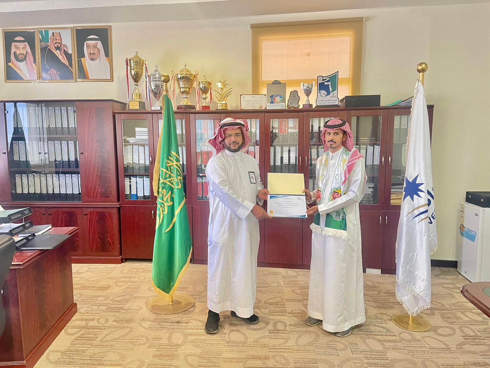 كرًم عميد كلية التربية الأستاذ الدكتور محمد بن عبد الله الحازمي يوم الخميس الموافق 3-3-1444هـ الفائز بالمركز الأول في المسابقة التي أقامتها الأنشطة الطلابية بالكلية والتي بعنوان " هي لنا دار" وذلك بمناسبة الاحتفاء باليوم الوطني السعودي (92) ، حيث فاز بالمركز الأول الطالب: جابر حسن جابر الشهري ببرنامج ماجستير تقنيات التعليم ، وذلك لتصميمه انفوجرافيك يعبر عن اليوم الوطني.