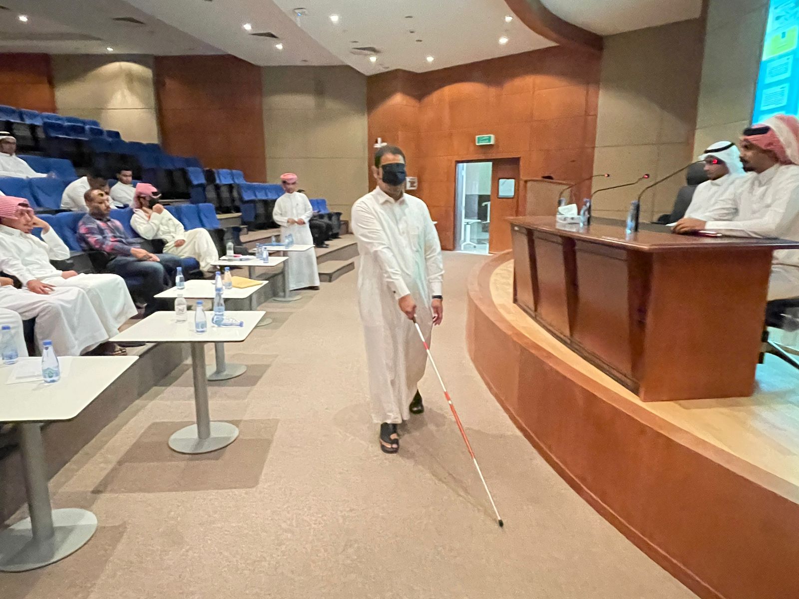 وقد تناولت ورشة العمل التي قدمها الدكتور صهيب سليم والطالب عبد الله الصقور (من ذوي الإعاقة البصرية) عدة محاور : العصاء البيضاء وأهميتها ، طرق الاستخدام الصحيح للعصا البيضاء، دور المجتمع تجاه الأشخاص من ذوي الإعاقة البصرية ، جهود المملكة العربية السعودية المقدمة للأشخاص ذوي الإعاقة البصرية ،وقد اختتمت ورشة العمل بنموذج تطبيقي إجرائي لكيفية استخدام العصا البيضاء .