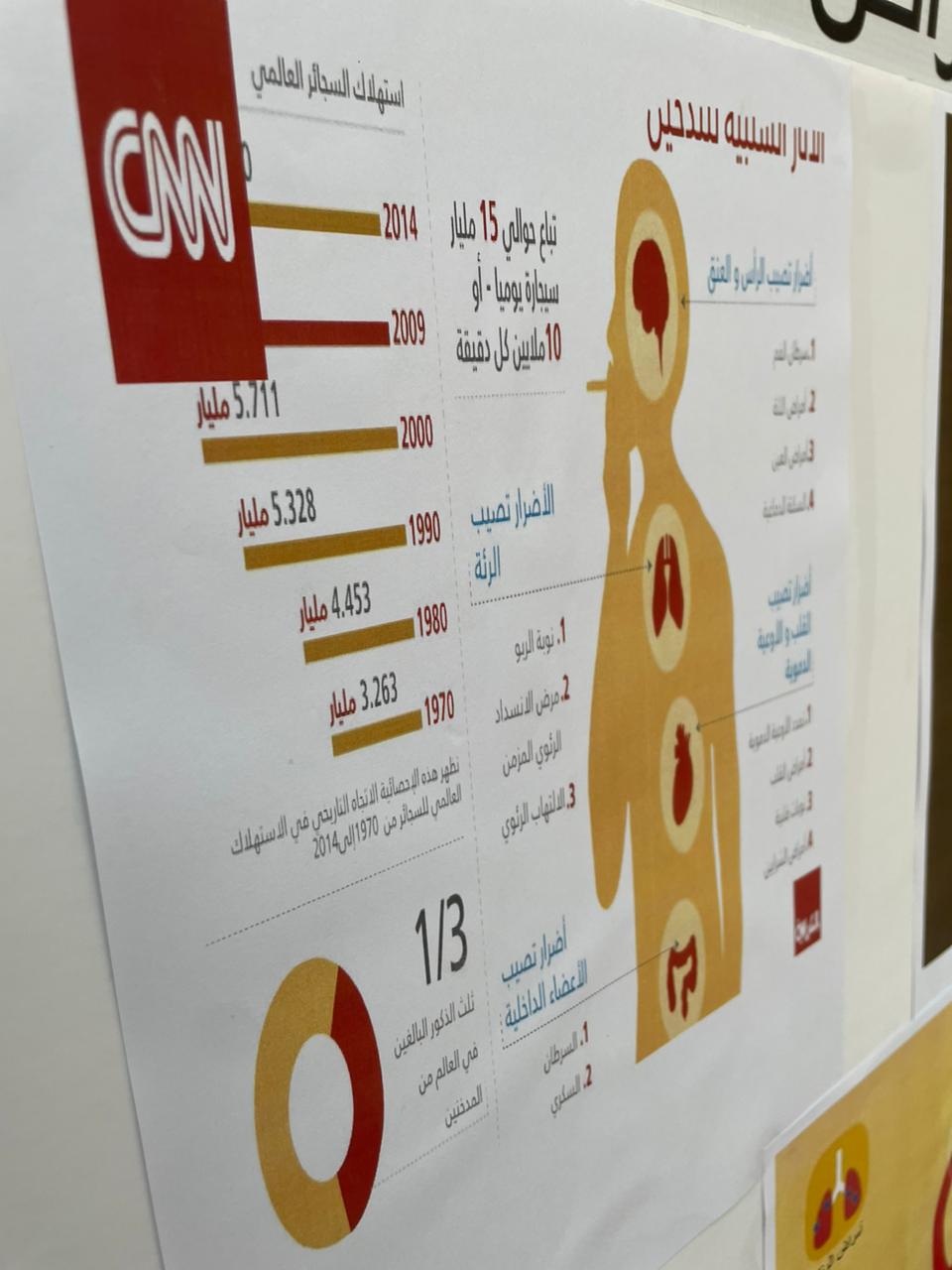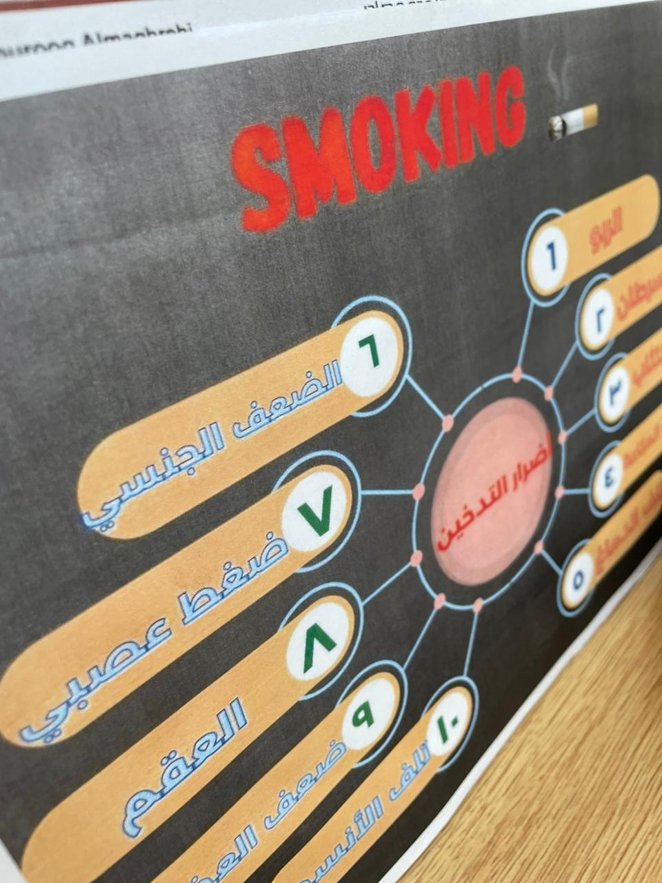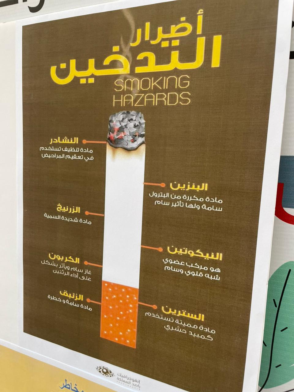 أقامت كلية التربية ممثلة في لجنة الأنشطة الطلابية يوم الخميس الموافق 12/ 11/ 1444هـ ركن توعوي تحت شعار "لا للتدخين " وذلك بمناسبة اليوم العالمي لمكافحة التدخين ، وقد اشتمل الركن الذي استهدف طالبات كلية التربية على عدة محاور : التعريف باليوم العالمي لمكافحة التدخين ، أنواع التدخين ومسبباته ، أضرار ومخاطر التدخين ، تأثير التدخين على الصحة العامة وجسم الإنسان ،طرق المساعدة للإقلاع عن التدخين ، كما أشتمل الركن على مطويات تعريفية وتوعوية عن أضرار التدخين وطرق الوقاية منه .