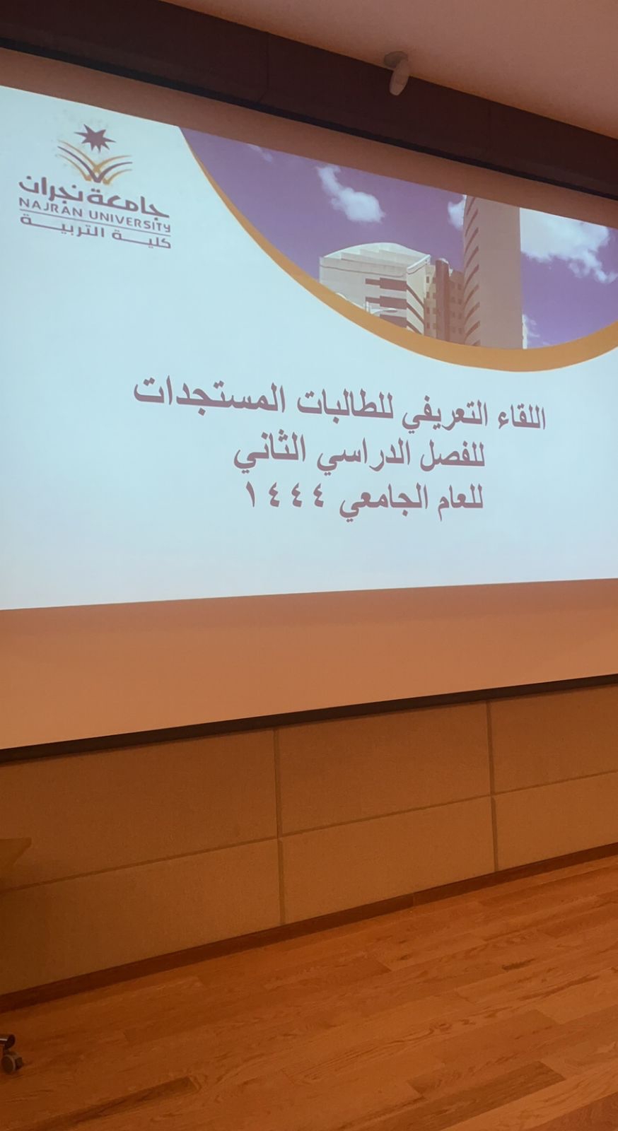أقامت كلية التربية شطر الطالبات يوم الاثنين الموافق 25–5- 1444هـ اللقاء التعريفي للطالبات المستجدات للفصل الدراسي الثاني للعام الجامعي 1444هـ