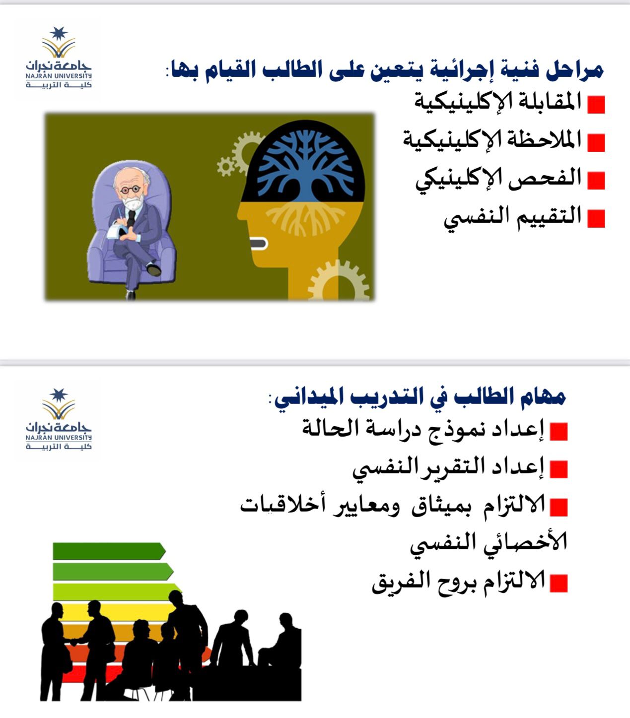 أقامت كلية التربية ممثلة في قسم التربية وعلم النفس يوم الخميس الموافق 5/3/1444هـ اللقاء التعريفي لطلبة التدريب الميداني لبرنامج بكالوريوس علم النفس للفصل الدراسي الأول 1444هـ ، وقد تناول اللقاء الذي قدمه الدكتور أسامه حسن جابر منسق التدريب الميداني بقسم التربية وعلم النفس عدة محاور منها : أهداف التدريب الميداني ، وعلاقة نواتج تعلم التدريب الميداني بنواتج تعلم برنامج بكالوريوس علم النفس ، المهام المكلف بها الطالب في مقرر التدريب الميداني ، المهارات التي يتسم بها طالب التدريب الميداني ، طرق تقييم مخرجات وأعمال الطالب في التدريب الميداني.