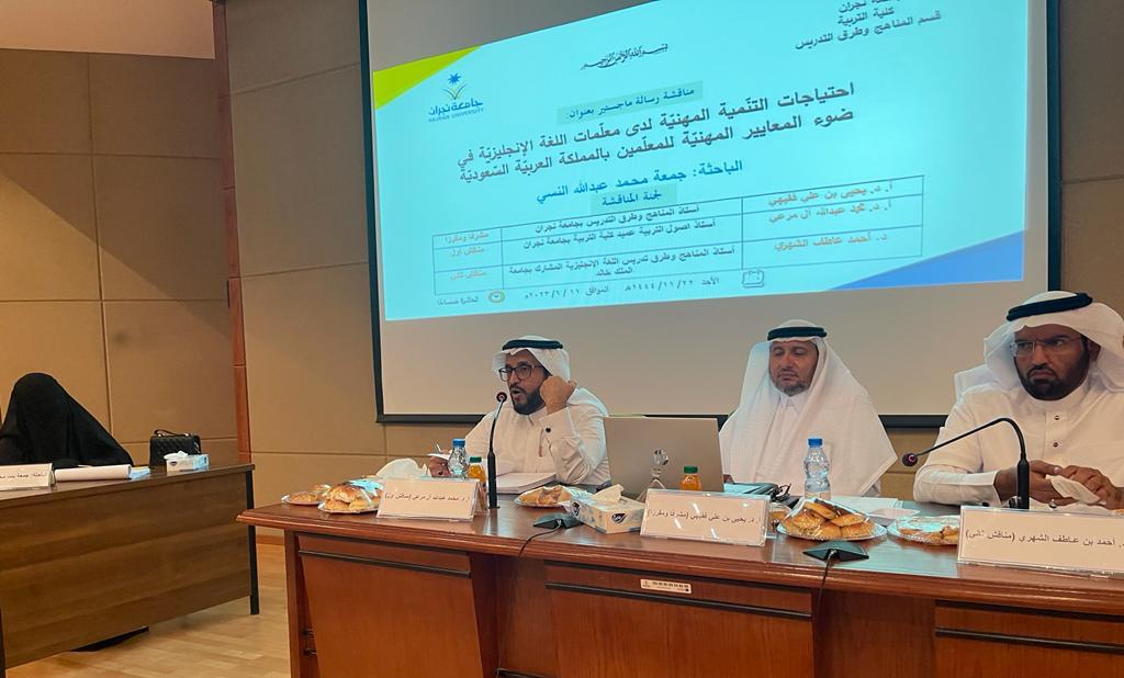 عقدت كلية التربية يوم الأحد الموافق 22/ 11/ 1444 هـ في مسرح الكلية مناقشة رسالة الماجستير الموسومة بـ "احتياجات التنمية المهنية لدى معلمات اللغة الانجليزية في ضوء المعايير المهنية للمعلمين بالمملكة العربية السعودية " المقدمة من الطالبة: جمعة محمد النسي، بقسم المناهج وطرق التدريس ، وقد تكونت لجنة المناقشة من أ.د. يحيى فقيهي مشرفاً ومقررا، وأ.د. محمد آل مرعي مناقشاً أول، ود. عاطف الشهري مناقشاً ثانِ، وقد استمرت المناقشة من الساعة العاشرة حتى الساعة الثانية عشرة ظهراً ، وقد أوصت اللجنة بقبول الرسالة مع استكمال التعديلات المطلوبة.