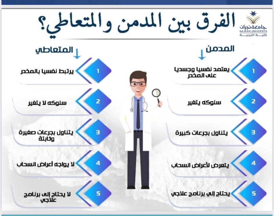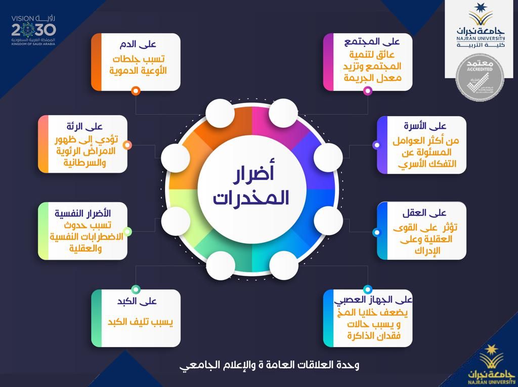 كما تناولت ندوة " المخدرات وأضرارها " والتي استهدفت طالبات كلية التربية عدة محاور أهمها : تعريف المخدرات وأنواعها ومراحلها،أسباب تعاطي المخدرات، المظاهر التي قد تظهر على الشخص المتعاطي للمخدرات ،أضرارها على الفرد والاسرة والمجتمع ،طرق للعلاج والوقاية منها
