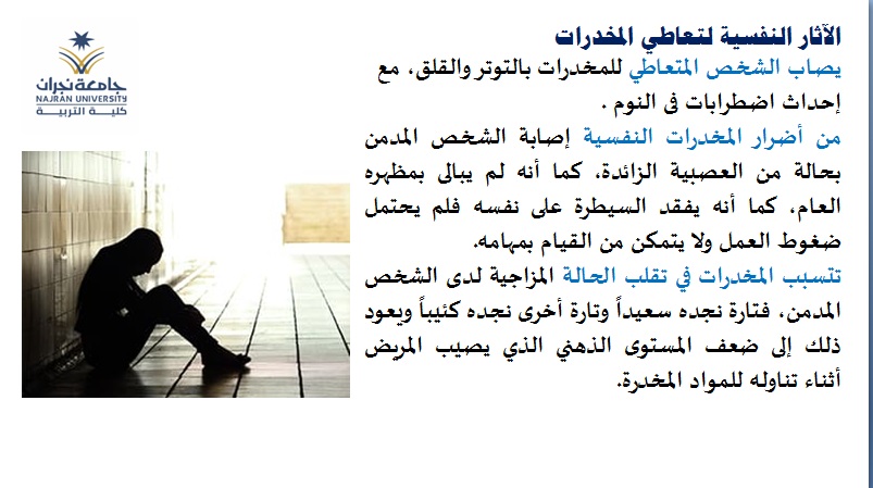 حيث أشتمل البرنامج التوعوي على عدد من المحاضرات والندوات منها: محاضرة عن "الآثار النفسية لتعاطي المخدرات" وقد استهدفت طلاب وطالبات كلية التربية وقد تناولت المحاضرة عدة محاور أهمها : المخدرات وأضرارها على الفرد والمجتمع ، دور المخدرات في تعطيل حركة التنمية في المجتمعات ، الآثار الصحية لتعاطي المخدرات ، متى يصبح الشخص مدمناً ، الآثار النفسية لتعاطي المخدرات ، علاقة تعاطي المخدرات بظهور الاضطرابات النفسية والعقلية