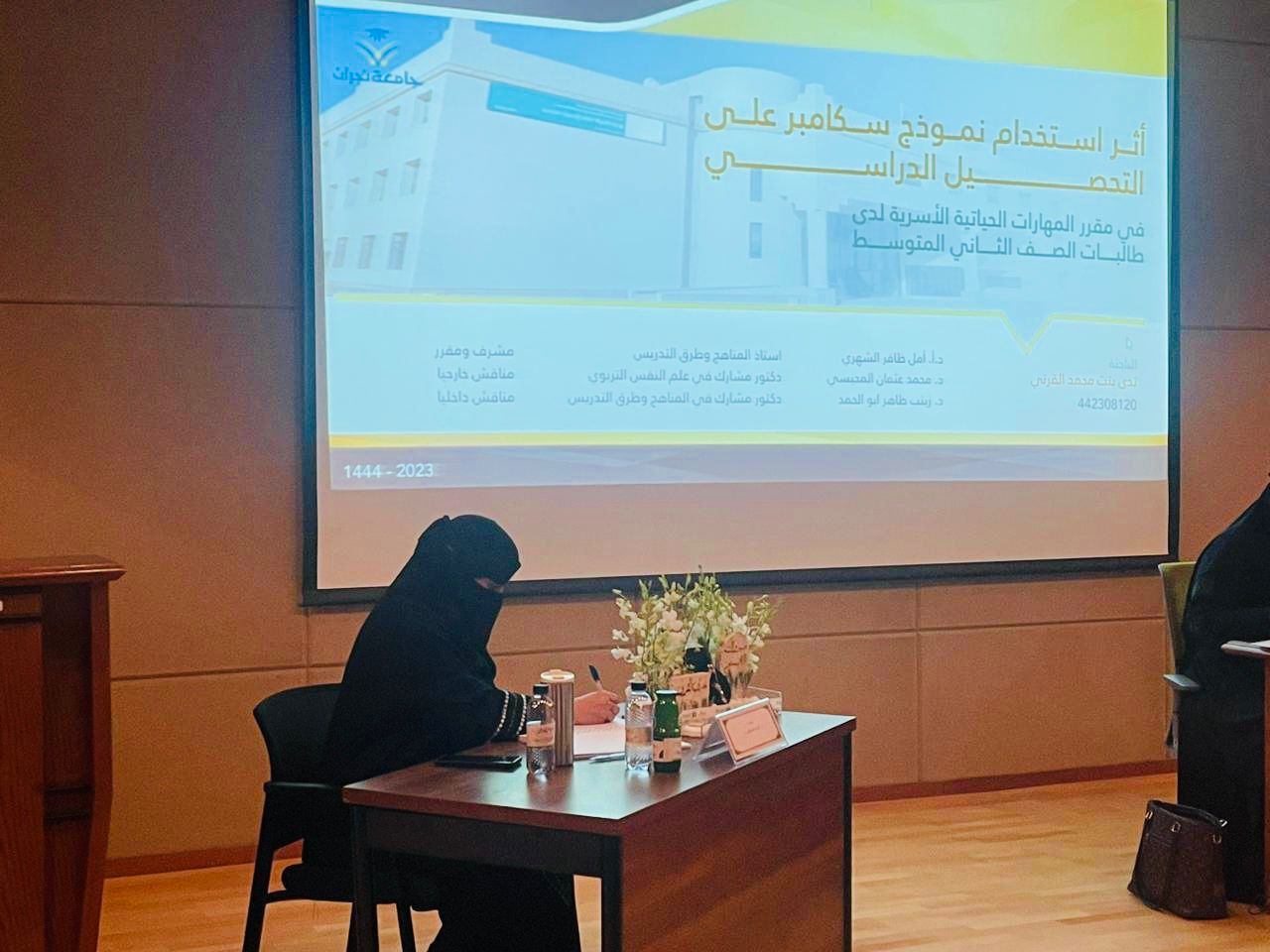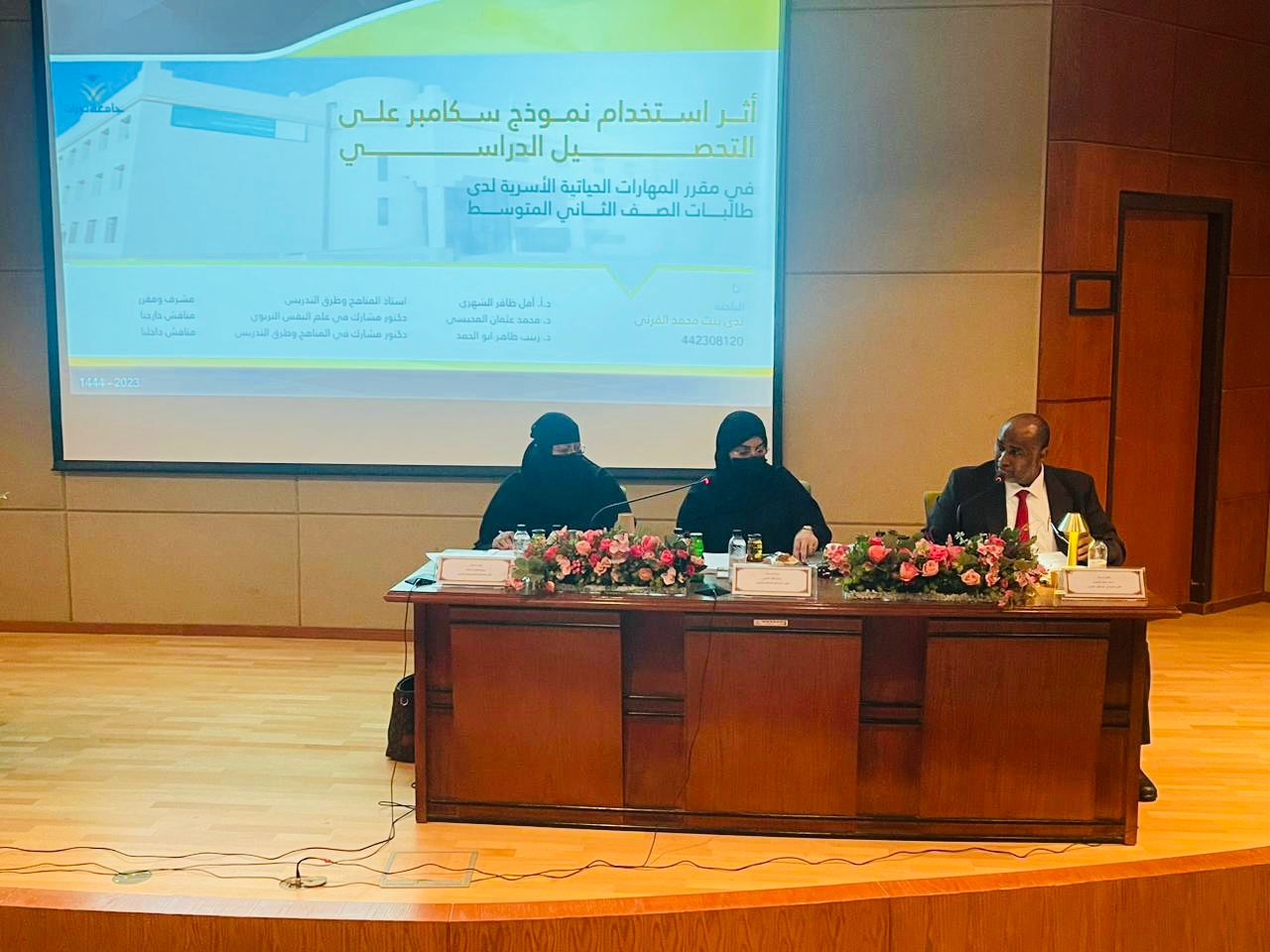 عقدت كلية التربية يوم الثلاثاء الموافق 24/ 11/ 1444هـ في مسرح الكلية مناقشة رسالة الماجستير الموسومة بـ "أثر استخدام نموذج سكامبر على التحصيل الدراسي في مقرر المهارات الحياتية الأسرية لدى طالبات الصف الثاني متوسط" المقدمة من الطالبة: ندى محمد عائض القرني، بقسم المناهج وطرق التدريس ، وقد تكونت لجنة المناقشة من أ.د. أمل ظافر الشهري مشرفاً ومقررا، ود. محمد عثمان المحيسي مناقشاً أول، ود. زينب طاهر أبو الحمد مناقشاً ثانِ، وقد أوصت اللجنة بقبول الرسالة مع استكمال التعديلات المطلوبة.