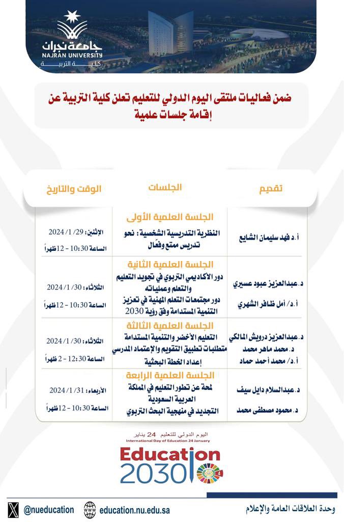 null أربع جلسات علمية ضمن ملتقى اليوم الدولي للتعليم تستمر على مدار ثلاثة أيام؛ وتستعرض تجارب ورؤى مختلفة