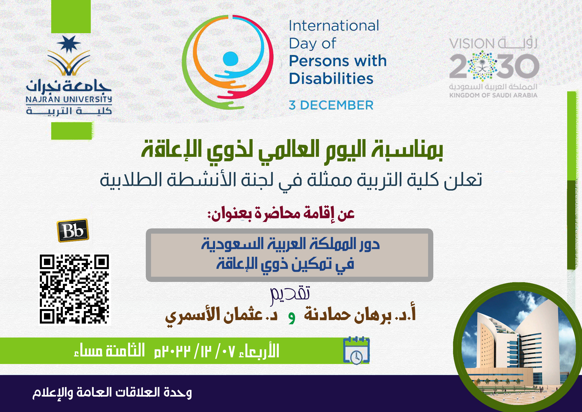 null بمناسبة اليوم العالمي لذوي الإعاقة تعلن كلية التربية ممثلة في لجنة الأنشطة الطلابية عن إقامة محاضرة