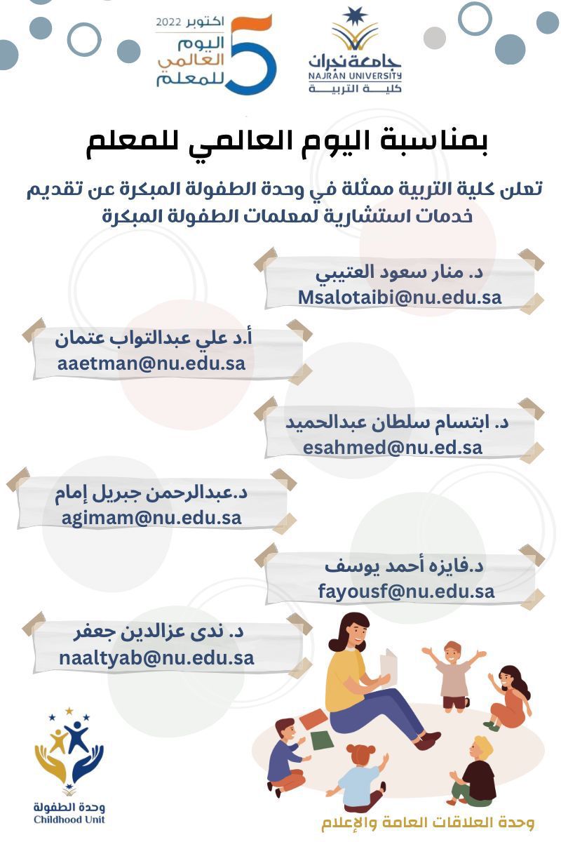 null بمناسبة اليوم العالمي للمعلم - تعلن كلية التربية عن تقديم خدمات استشارية لمعلمات الطفولة المبكرة