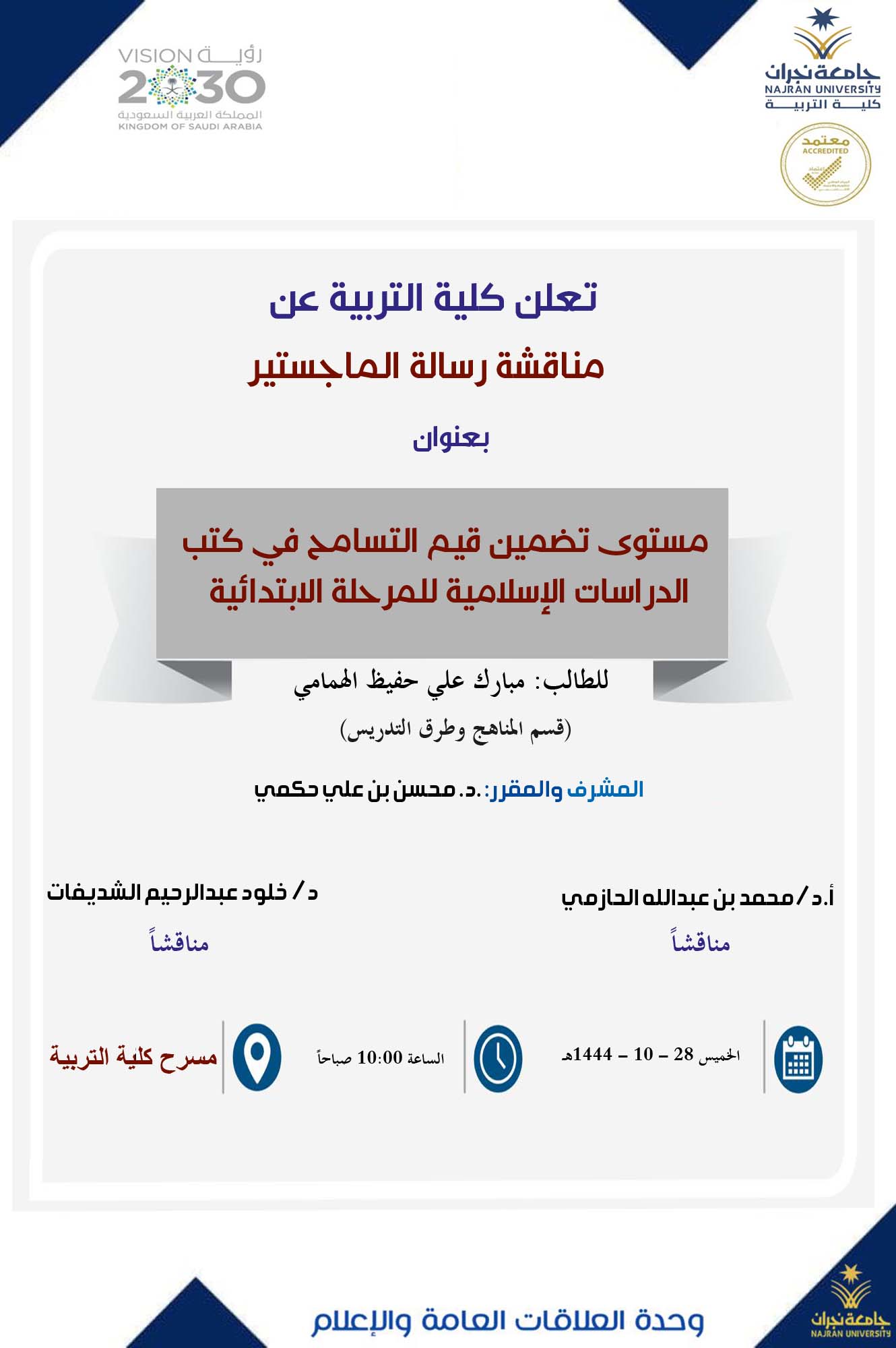 null تعلن كلية التربية عن مناقشة رسالة ماجستير بقسم المناهج وطرق التدريس