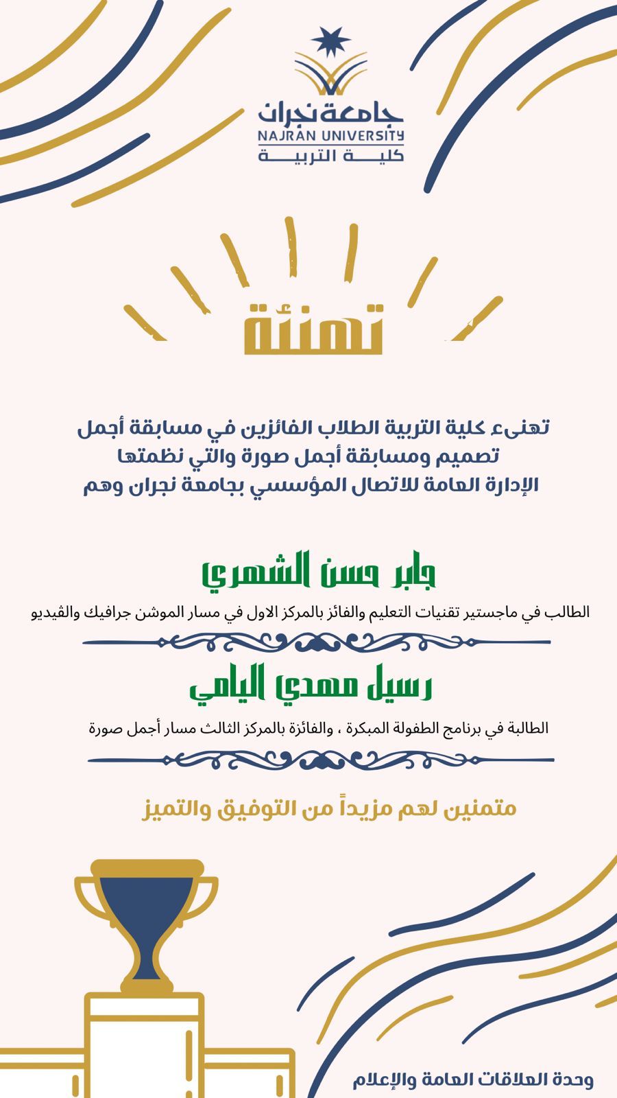 تهنئ كلية التربية الطلاب الفائزين في مسابقة أجمل تصميم ومسابقة أجمل صورة والتي نظمتها الإدارة العامة للاتصال المؤسسي بجامعة نجران